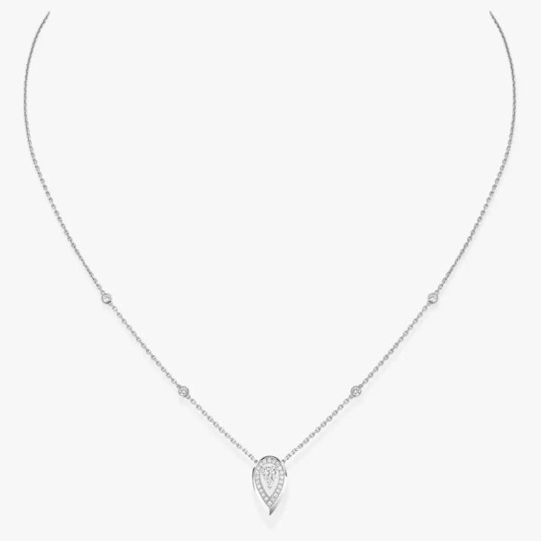 The diamond necklace for those who aren’t afraid to assert themselves. With Fiery, Valérie Messika embodies her passion for jewelry. Fiery is her passion, her love for pear-cut diamonds, her desire to play with opposites and explore contrasts of design, shape and light… With its 0.10-carat center stone surrounded by delicately set diamonds, this white gold diamond necklace dresses the skin in fiery radiance.