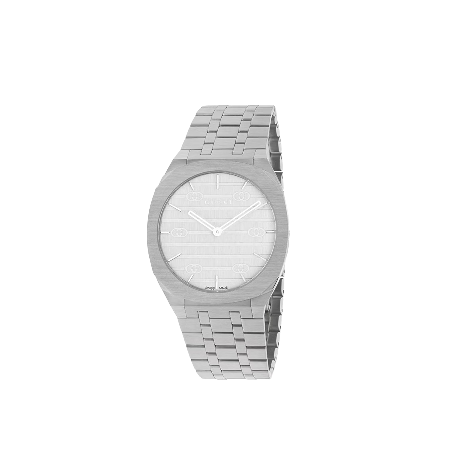 The GUCCI 25H’s streamlined silhouette was inspired by the sleek forms of contemporary architecture. The watch is presented with a thin multi-layer case and five-link steel bracelet, while the design is completed by a silver brass dial and Interlocking G motif. The name, GUCCI 25H, is attributed to a particularly symbolic talisman for Creative Director Alessandro Michele. 34mm stainless steel multi-layered case, silver brass dial with Interlocking G motif, five link stainless steel bracelet.