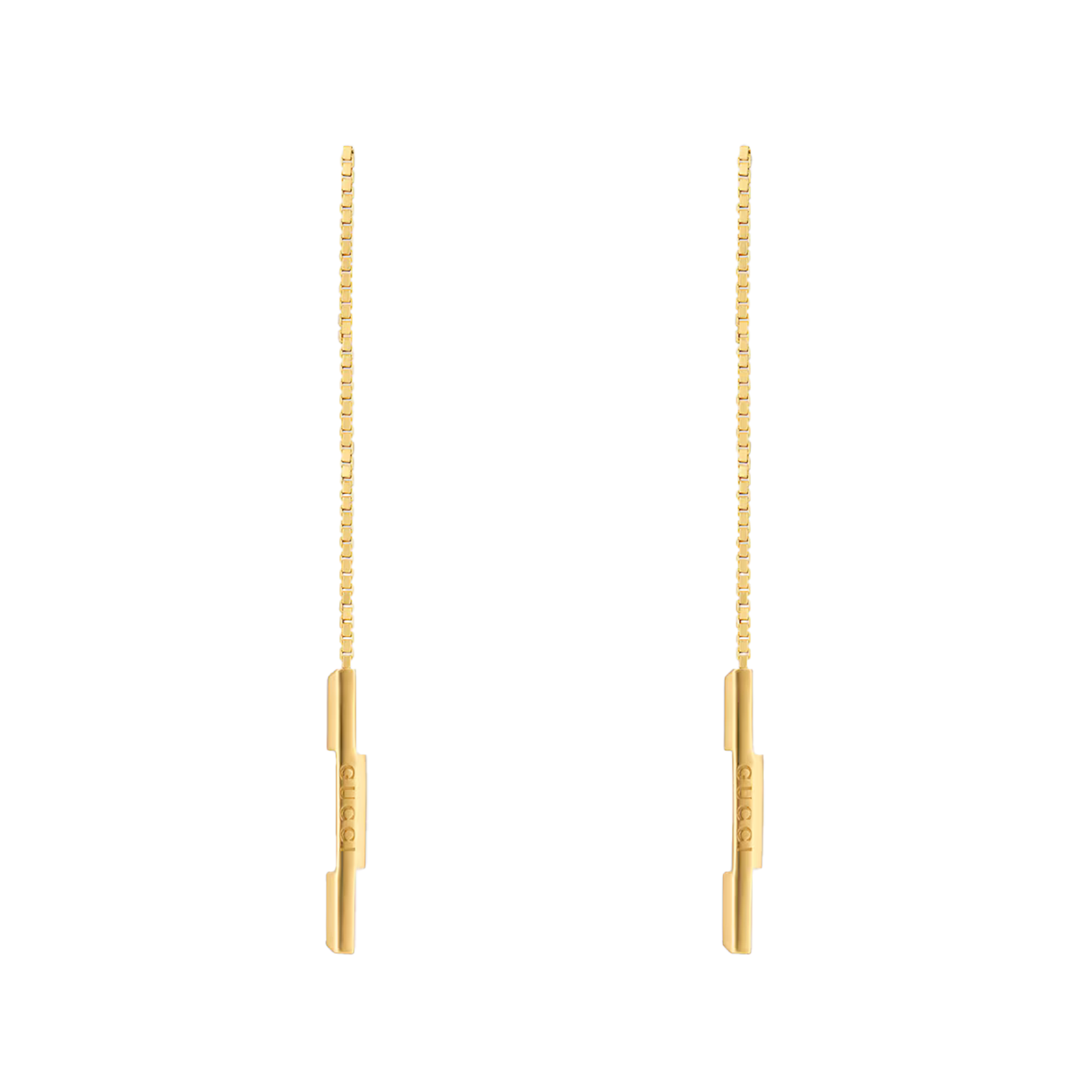 The Gucci Link to Love collection is an exploration of modern romance characterizing new symbols of love. The collection combines different gold tones and a mix of finishes blending the lines between masculine and feminine. Each piece is meant to inspire individualized ways to wear them with stackable and layered features. This 18k yellow gold chain earrings have a ‘Gucci’ engraving on the bar pendant.