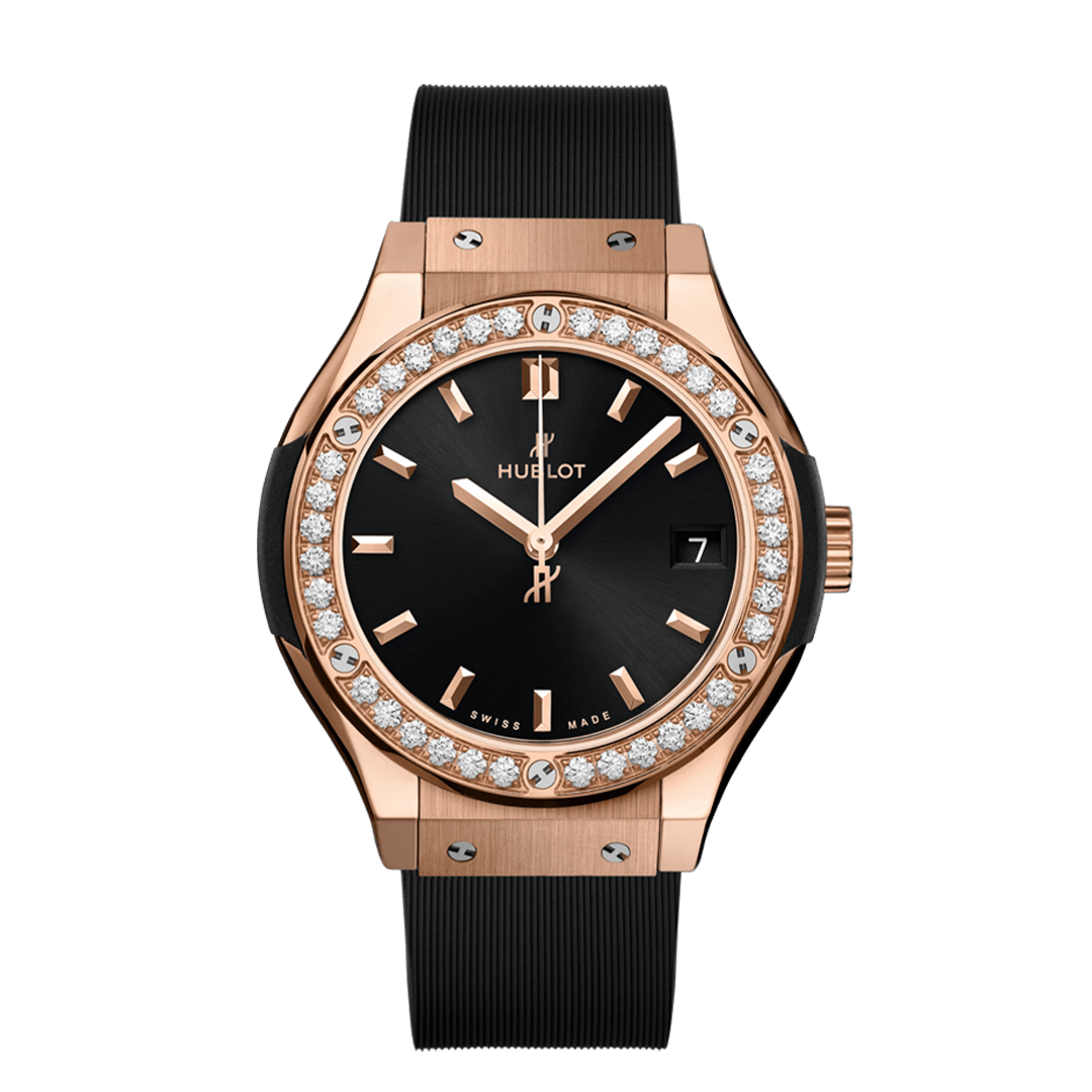 As a master of fusion and an alchemist of precious metals, Hublot has developed a new gold color with a warmer shade than the traditional 5N 18K gold. Containing mainly platinum, this exclusive King Gold alloy perfectly lends itself to all elements of polishing and satin finishing. Hublot watches blend the most unexpected materials like high-tech ceramic, rubber and carbon.