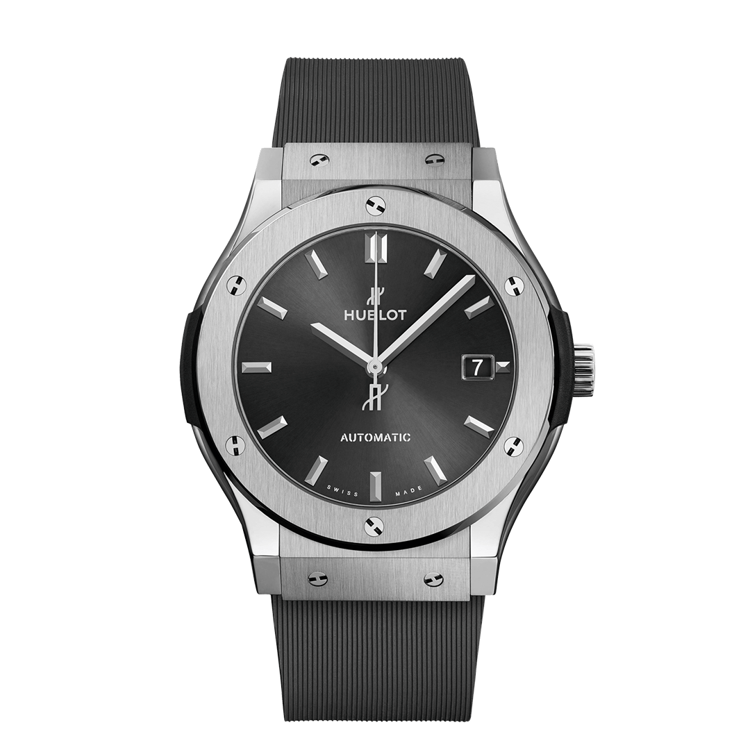 Titanium is extensively used by Hublot, specifically for its lightness. It displays the best relationship between resistance and weight of any material, which makes it an extremely popular material especially within aeronautics. It also stands out with its resistance to corrosion and its inertia in contact with the skin. Hublot only uses high quality, grade 5 titanium, the strongest there is. Once polished, this material retains a slightly bluish metallic sheen.