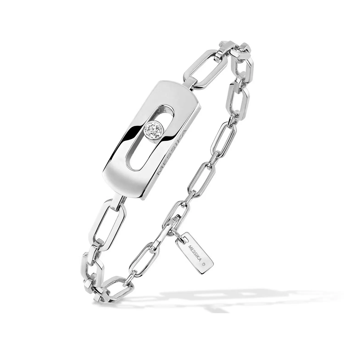 Interchangeable My Move metal chain bracelet available in white gold. 9g gold weight with diamonds totaling 0.01 carats, G/VS quality.