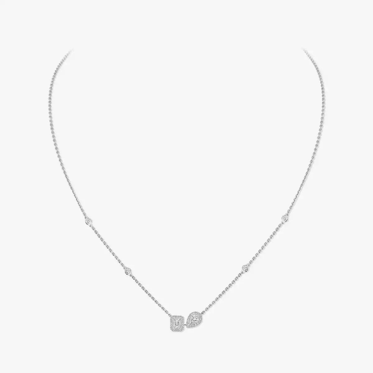 My Twin celebrates the harmony of opposites: the graphic lines of the emerald-cut diamond and the sensuality of the pear-cut diamond. An exceptional duo, elevated by this white gold and diamond necklace. One of the Maison’s signature codes, the subtle openwork pavé entourage, intensifies the sparkle of the central stones. The angled setting of the pear-cut diamond adds a modern accent to the piece. This easy-to-wear diamond necklace for women will be with you throughout all of life’s moments. Try styling it with other luxury jewelry pieces by the Maison for an even bolder look.