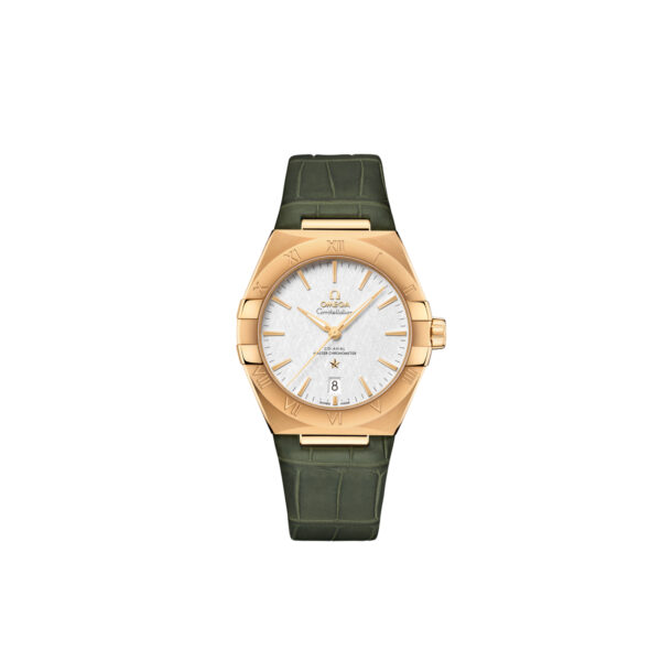 This 39 mm 18K yellow gold model features a bezel engraved with Roman numerals, a silk-embossed white silvery dial and a date window at the 6 o’clock position. The hands, OMEGA logo, Constellation star and indexes are all in 18K yellow gold.