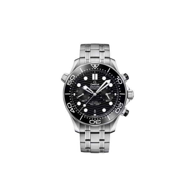 This 44 mm chronograph model is crafted from stainless steel and includes a polished black ceramic bezel with a white enamel diving scale. The pushers are also polished black ceramic, as well as the dial which features laser-engraved waves and a date window at 6 o’clock.