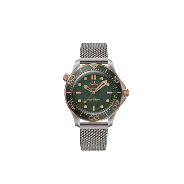 This 42 mm model is crafted in grade 2 titanium and OMEGA’s exclusive 9K Bronze Gold. It includes a green oxalic anodized aluminium bezel ring with a diving scale in vintage Super-LumiNova.