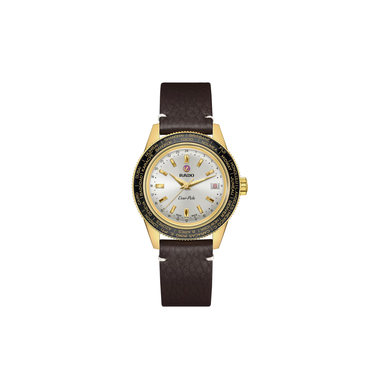 The Captain Cook Over-Pole is back! A stunning new Limited Edition reprises the key features of previous versions, in particular the R862 Worldtimer manual-winding movement. Robust, precise, and guaranteed to perform thanks to rigorous in-house testing in 5 separate positions, it is mounted within a bold 39 mm case. Côtes-de-Genève surface finishing, blued screws and gold-coloured details are easily admired through the sapphire crystal on the back. As sleek as it handsome, the new version comes with a stylish yellow gold PVD stainless steel bracelet with three-fold clasp. The bracelet is easily exchanged with a rugged brown leather strap thanks to Rado’s Easy-Clip system. In addition, the new Over-Pole comes with a practical leather pouch to store the watch and extra strap, and is accompanied by an official Limited Edition Certificate.