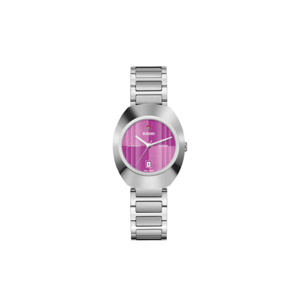 An iconic symbol of Swiss craftsmanship and pioneering innovation. The Rado Diastar is designed for those who dare to embrace the extraordinary. The 30 mm case, crowned by a polished platinum-coloured Ceramos™ bezel, merges effortlessly with a polished stainless-steel middle case, offering water resistance up to 10 bar (100 metres). The purple dial, brushed in two directions, plays elegantly with light, highlighting the iconic silver-coloured moving anchor and a meticulously positioned date window at 6 o’clock. Rhodium-coloured hands with white Super-LumiNova® ensure perfect readability at all times. This refined display is safeguarded by vertical faceted sapphire crystal with anti-reflective coating inside. At its heart lies the automatic R586 calibre, finely regulated in five positions and featuring a Nivachron™ hairspring, this movement delivers a high level of accuracy and 48-hour power reserve.