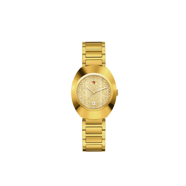 An iconic symbol of Swiss craftsmanship and pioneering innovation. The Rado DiaStar is designed for those who dare to embrace the extraordinary. The 30 mm case, crowned by a polished yellow gold-coloured PVD coated Ceramos™ bezel, merges effortlessly with a polished yellow gold-coloured PVD coated stainless-steel middle case, offering water resistance up to 10 bar (100 metres). The dial features a yellow-coloured harmonic pattern laying against a diamond-powder-like background combined with 11 cubic zirconia set in yellow coloured mount, playing elegantly with light, highlighting the iconic gold-coloured moving anchor and a meticulously positioned date window at 6 o’clock. Yellow gold-coloured hands with white Super-LumiNova® ensure perfect readability at all times. This refined display is safeguarded by vertical faceted sapphire crystal with an anti-reflective coating inside. At its heart lies the automatic R586 calibre. Finely regulated in five positions and featuring a Nivachron™ hairspring, this movement delivers a high level of accuracy and 48-hour power reserve. The overall appearance of this iconic timepiece is completed with a yellow gold coloured PVD coated stainless-steel bracelet, blending polished links and brushed middle links, secured by a polished, yellow gold coloured, PVD coated, stainless steel 3-fold clasp.
