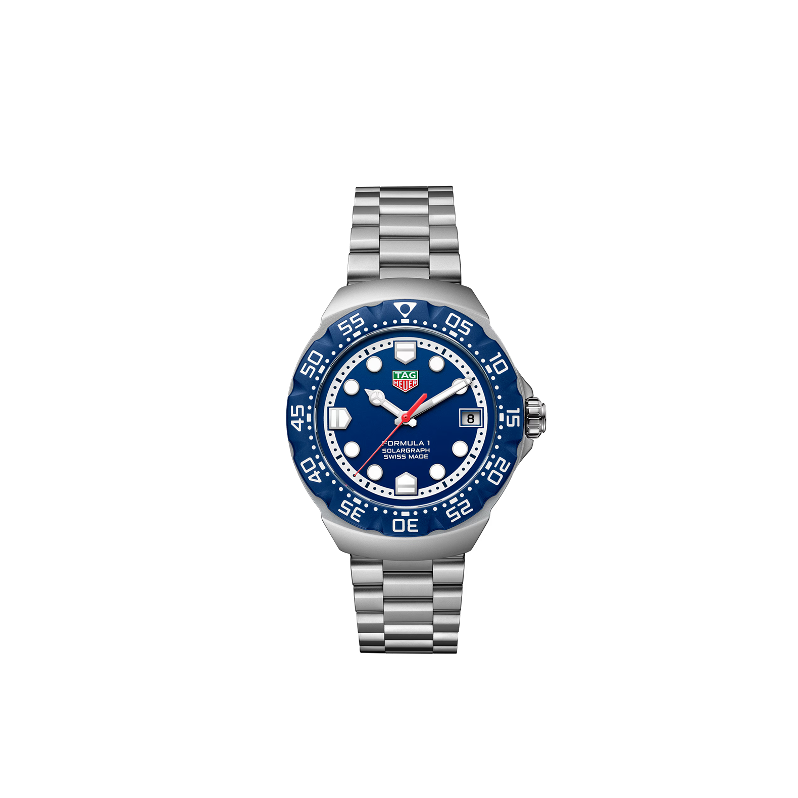 Inspired by the original Series 1 watch, the TAG Heuer Formula 1 Solargraph in 38mm expands the energetic aesthetic with a vibrant blue dial and sleek design. Combining a playful style with functionality, this solar-powered timepiece is made for trendsetters who value both style and innovation.