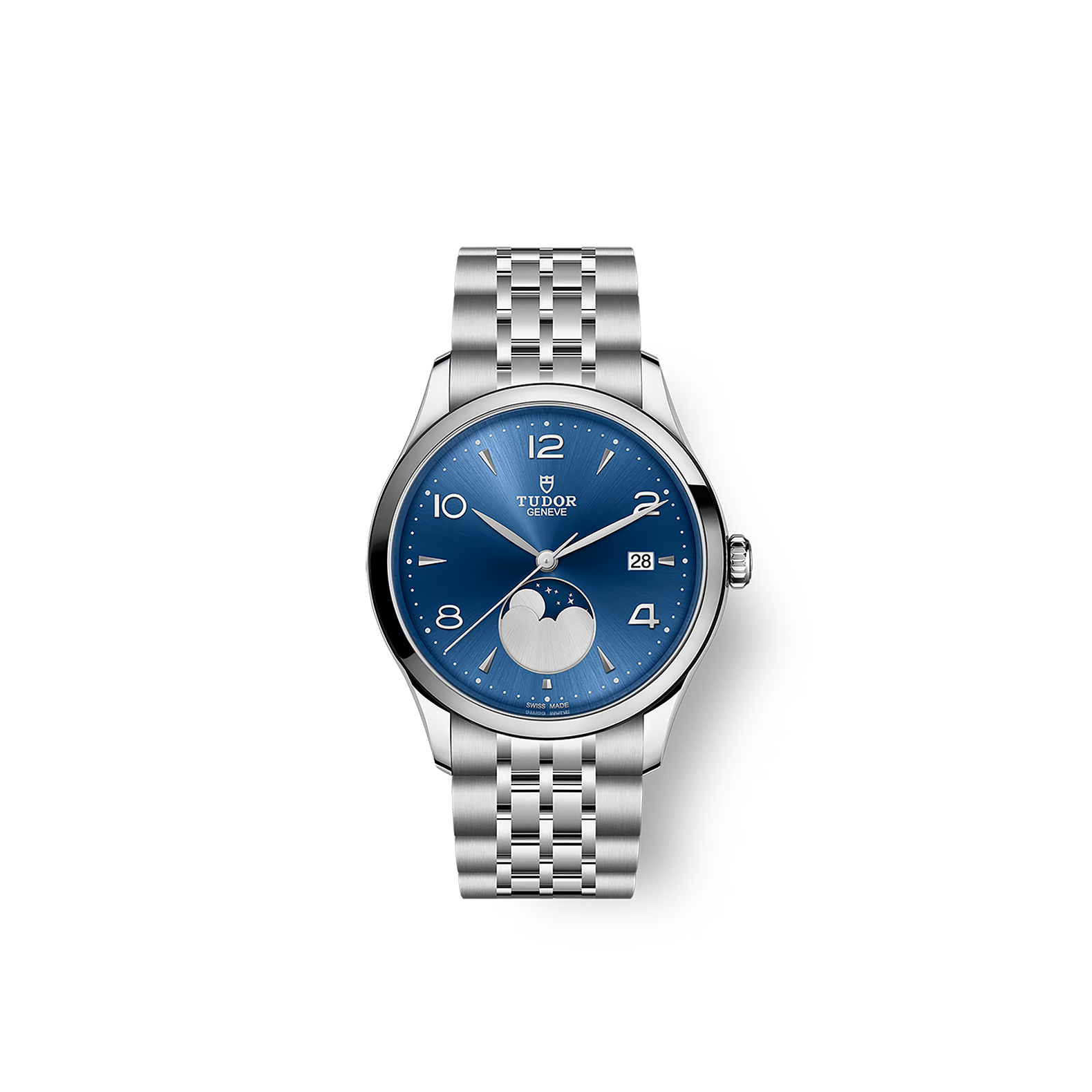The TUDOR 1926 Luna features black, blue or champagne-colour sun-brushed dials, domed for a vintage touch, and a TUDOR metal seven-link bracelet. The wealth of detail on the dials of the 1926 line creates a striking and intricate play of light that perfectly complements the sword-shaped hands with their matching colours, and the moon phase indicator at 6 o’clock adds poetry to the watch.